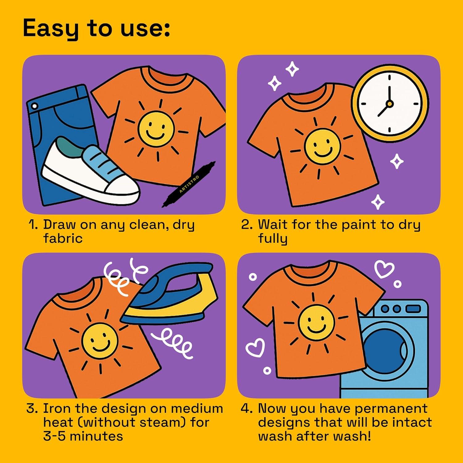 Safe & Easy-to-Use: Conforming to ASTM D-4236 standards, these fabric markers are non-toxic and safe for kids, teens, and adults. Just draw on clean, dry fabric, allow to dry, and heat-set with an iron for long-lasting, washable designs.