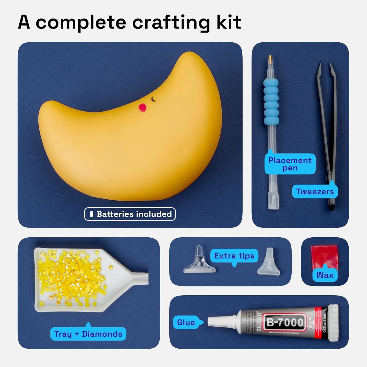 COMPLETE CRAFTING KIT: Our arts and crafts diamond painting kit includes everything you need to get started from the arts and crafts for kids ages 8-12 night light for kids figurine to colorful gems. The diamond painting accessories also includes a placement pen with tips for 1, 3, or 9 diamonds, glue, clay, and a sorting tray. Our diamond painting kits include batteries so you can immediately illuminate your creation!